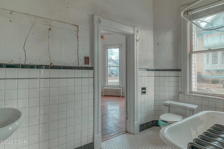 The bathrooms, though modest, carry hints of the home’s original fixtures and offer ample opportunity for tasteful restoration.
