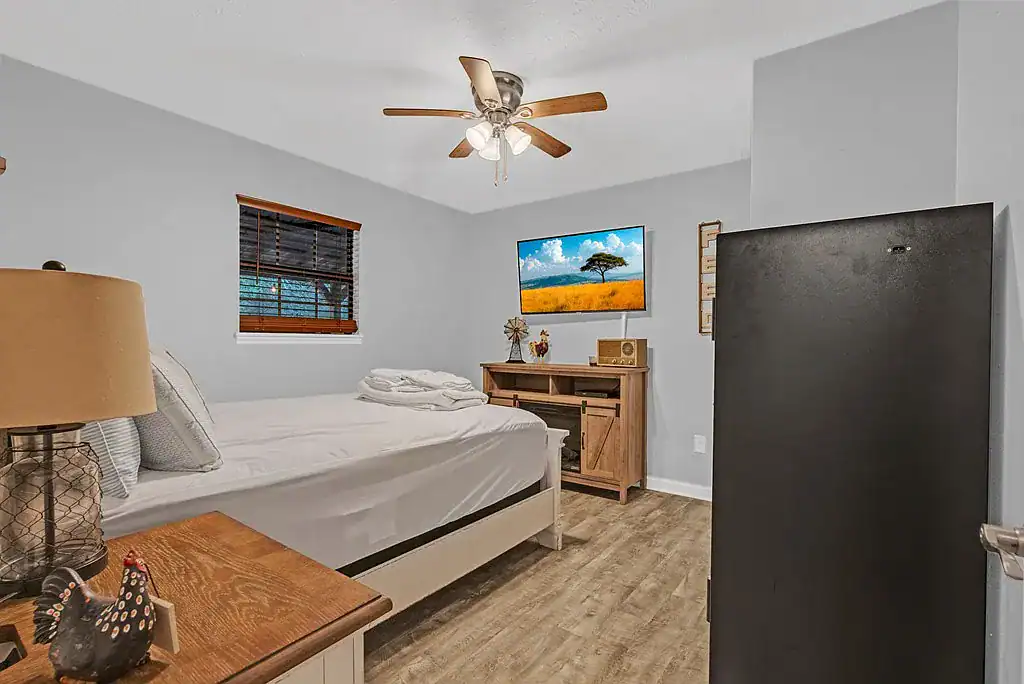 The exterior of the home is built for durability and long term function. A metal roof reduces maintenance needs and offers a long service life. Steel pan windows and built in blinds are designed for energy efficiency and easy upkeep. Ceiling fans are placed throughout the home and central heating and cooling systems allow the home to remain comfortable in any season. These features support both full time living and extended stays during vacations.