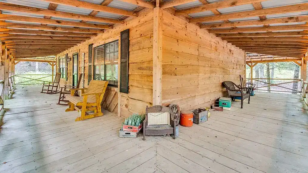 One of the most attractive features of the property is the eight foot wide wraparound porch that extends along multiple sides of the home. This porch offers outdoor living space large enough for dining, relaxing and entertaining. From the porch, owners can view a creek at the front of the home and another peaceful water feature at the back. These water features add to the sense of privacy and connection to nature and allow the property to feel like a personal retreat within the trees.