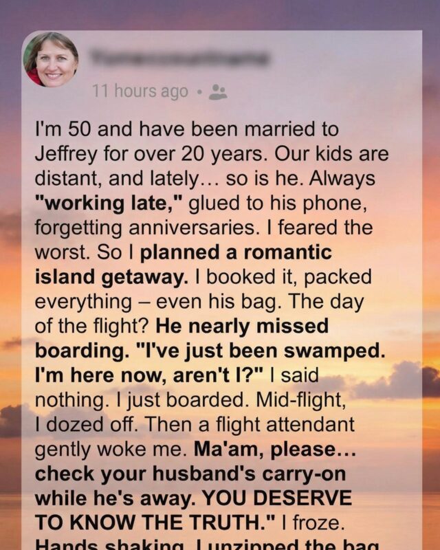I’m 50 and have been married to Jeffrey for over 20 years. Our kids are distant, and lately… so is he. Always “working late,” glued to his phone, forgetting anniversaries. I feared the worst. So I planned a romantic island getaway. I booked it, packed everything—even his bag. The day of the flight? He nearly missed boarding. “I’ve just been swamped. I’m here now, aren’t I?” I said nothing. I just boarded. Mid-flight, I dozed off. Then a flight attendant gently woke me. “Ma’am, please… check your husband’s carry-on while he’s away. You deserve to know the truth.” I froze. My heart pounded as confusion and fear washed over me. I stared at the overhead bin, wondering what kind of truth could possibly be hidden inside something so ordinary.