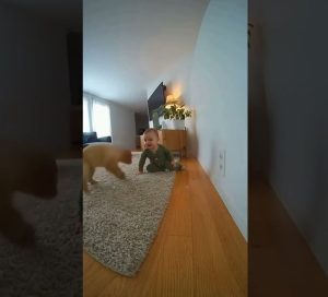 It was a quiet afternoon in the living room sunlight streaming through the curtains, soft music playing, and the gentle sound of a baby babbling on the carpet. The family’s young puppy, a fluffy ball of energy with curious eyes, lay nearby gnawing on a toy.
