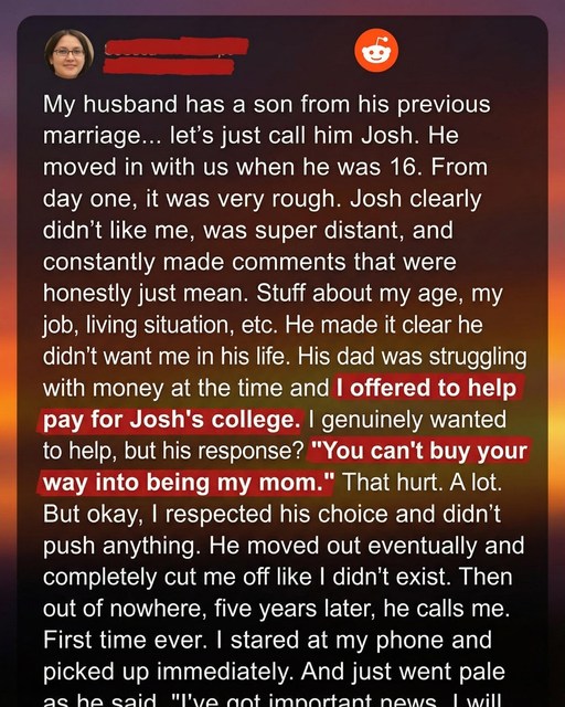 My husband has a son from his previous marriage… let’s just call him Josh. He moved in with us when he was 16. From day one, it was very rough. Josh clearly didn’t like me, was super distant, and constantly made comments that were honestly just mean. Stuff about my age, my job, living situation, etc. He made it clear he didn’t want me in his life. His dad was struggling with money at the time and I offered to help pay for Josh’s college. I genuinely wanted to help, but his response? “You can’t buy your way into being my mom.” That hurt. A lot. But okay, I respected his choice and didn’t push anything. He moved out eventually and completely cut me off like I didn’t exist. Then out of nowhere, five years later, he calls me. I still remember that moment—my phone lit up with a number I hadn’t seen in years, and for a second, I just stared at it, unsure whether to answer. When I finally picked up, his voice sounded nothing like the sharp teenager who’d once kept a wall between us. He sounded hesitant, quiet, even nervous. He apologized for reaching out so suddenly and said he hoped I didn’t mind him calling. Before I could decide what to feel, he added softly, “I need to talk to you.” There was no anger, no sarcasm, only sincerity. And hearing that shift cracked open something in me I hadn’t realized I’d been holding for years—an ache shaped like an unreturned effort to connect.