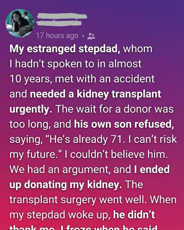 I hadn’t spoken to my stepfather in nearly ten years when I got the call. Life had quietly pulled us in different directions after my mother passed away, and what little connection we had faded into silence. When I learned he had been in a serious accident and urgently needed medical help, I felt conflicted—concern mixed with distance, compassion tangled with old memories. Doctors explained that his condition required a transplant, and the waiting list could take too long. I was surprised to learn that his biological son declined to step forward, choosing instead to focus on his own future. The news sat heavily with me, reopening emotions I thought I had long resolved.