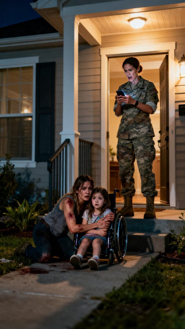 I unlocked the deadbolt and cracked the door. She was barely standing, rain-soaked hair plastered to her face, one eye already swelling shut. Her little girl, Khloe—eight years old, wheelchair-bound, gripping the armrests so hard her hands trembled—was wedged against her side.