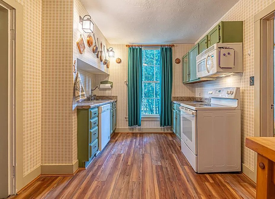 Its layout provides ample storage and work surfaces, while the tile floor ensures durability and easy cleaning. Whether you enjoy preparing simple meals or cooking for gatherings, the kitchen is designed to support practical, everyday living.