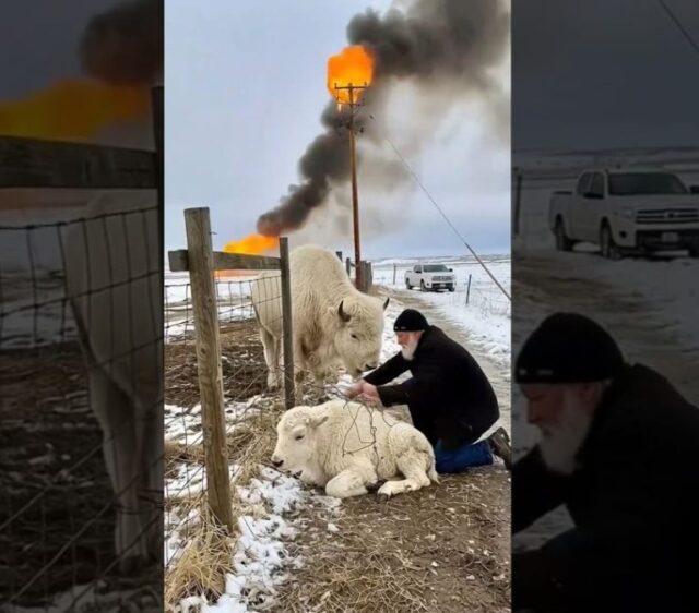 From the truck bed he pulled a ladder—heavy, scuffed, good steel with wide rungs. He slid it forward on the snow until the front rails hooked the lip. The trapped adult lifted its head and held still, nostrils flaring, as if measuring the angle. The calf pressed against the adult’s side, all knees and panic. The rescuer took a careful breath and climbed down backward, one boot at a time, feeling the raw dirt crumble under his heels. The pit smelled like thawed earth and fear.