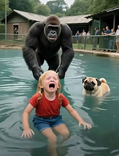 It was one of those sun-washed zoo afternoons when strollers roll in slow lines, laughter skips between exhibits, and every turn promises a new wonder. A small girl with bright, honey-colored hair wandered to the edge of the gorilla habitat, a tiny pug tucked in her arms like a plush toy. She leaned in—just a little—and the world tilted. In an instant, she slipped over the stone barrier and tumbled down into the shallow moat below.