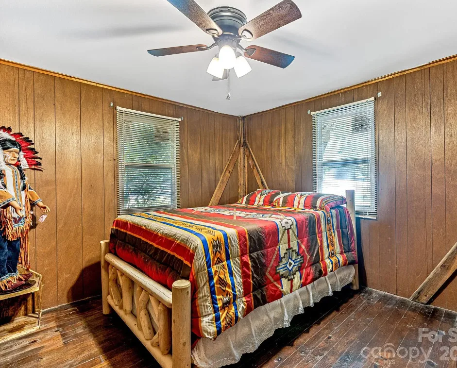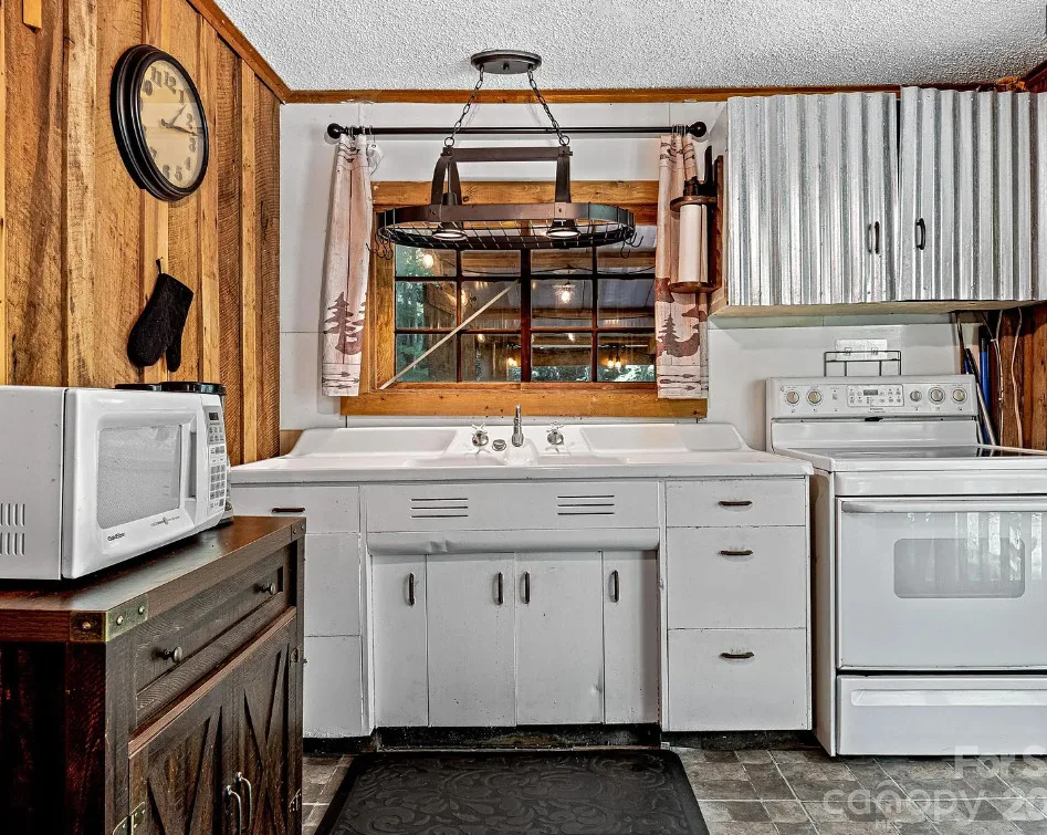 This cabin sure is cute! The cabin was built in 1946. It is located on 1/2 acre in Black Mountain, North Carolina. The house features a covered front porch, a covered side porch, wood floors, wood walls, large fireplace and a great kitchen sink. Two bedrooms, one bathroom and 576 square feet. $195,000 New price: $190,000