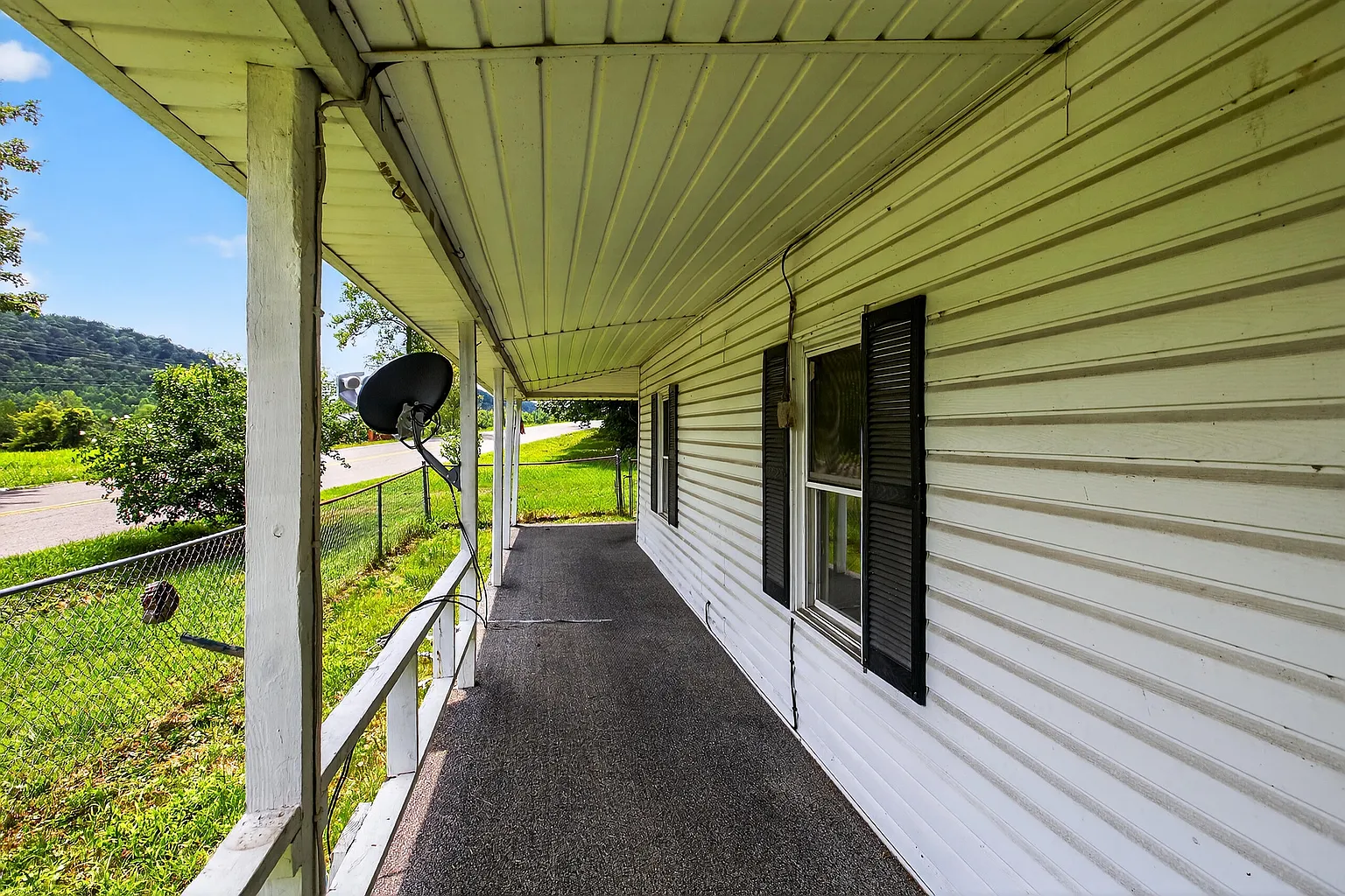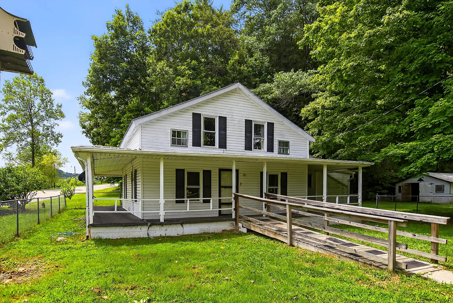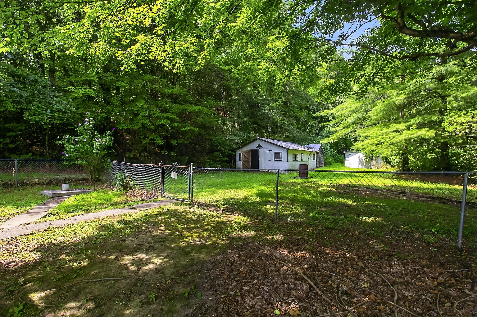Outside, you’ll find rolling wooded acreage, a storage outbuilding, and a porch perfect for enjoying the quiet surroundings. There’s also a chain-link fenced area for pets or gardening, plus scenic wooded and water views from various points on the property.