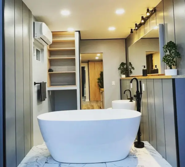 People rarely associate container homes with luxury — but Will’s bathroom breaks every stereotype.