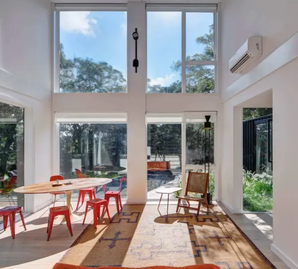 To move away from the “boxy” container feel, Will installed large custom-built windows. Some sections of the home now feature floor-to-ceiling glass walls, giving the house: