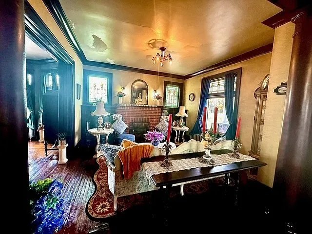 From the moment you approach, the property’s impressive presence makes a lasting impression. A grand double-door entrance, framed by original tile work, welcomes visitors with a flourish rarely seen in modern construction. The artistry observed at the threshold extends throughout the interior: rich woodwork, stained glass accents, hardwood floors, and carefully laid tile are all reminders of a time when homes were built with meticulous attention to detail and long-lasting materials.