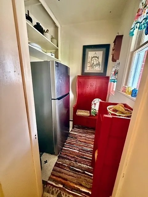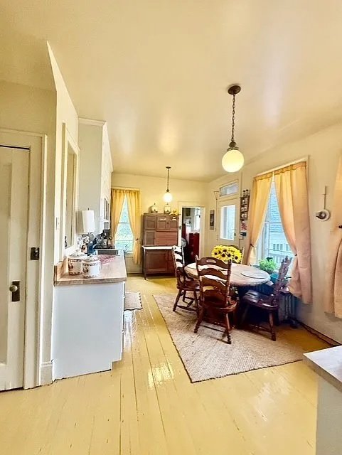 The kitchen serves as a thoughtful blend of the old and the new. Updated with warm butcher block countertops, it retains a timeless, welcoming atmosphere while offering a comfortable space for daily use. The layout lends itself beautifully to further personalization, allowing the next occupants to celebrate the home’s history while incorporating contemporary comforts.