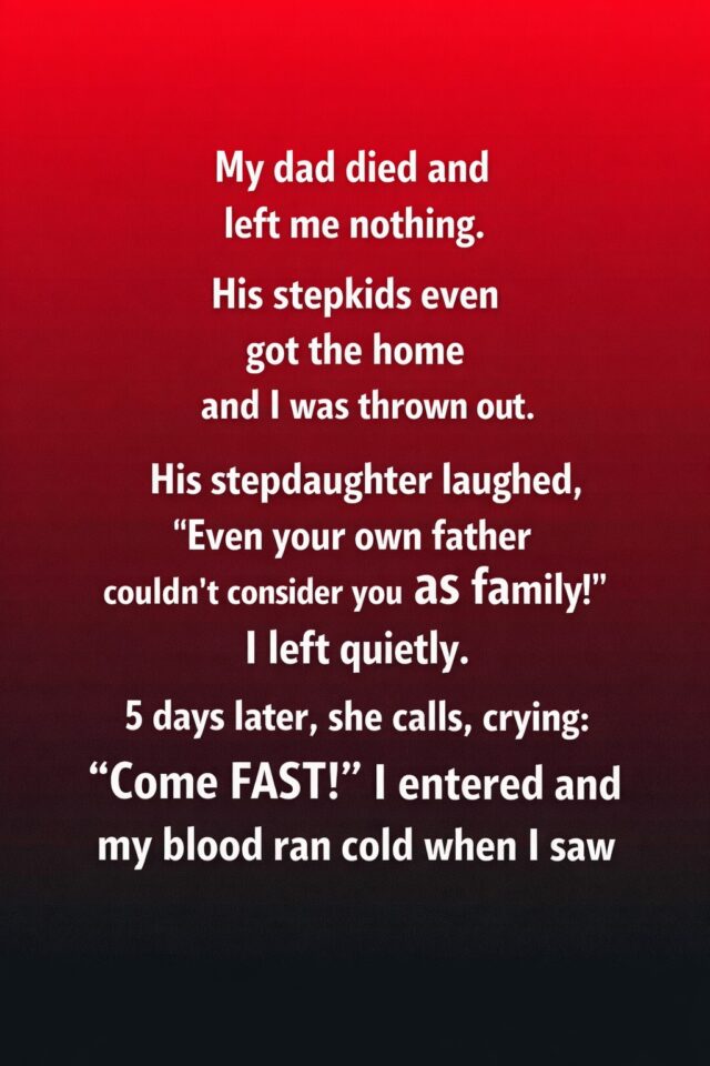 Grief has a way of arriving quietly and rearranging everything. When my father passed away, I expected sadness, memories, and maybe a sense of closure. What I did not expect was to be left with nothing—not even a place to stand. His home, the one I grew up visiting on weekends, was handed over to his stepchildren, and I was asked to leave with little explanation. The words spoken that day stayed with me far longer than the boxes I carried out. I didn’t argue or plead. I simply gathered what I could, nodded once, and walked away, choosing silence over bitterness because I had already lost enough.