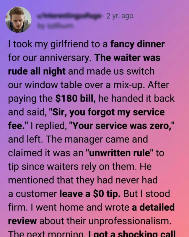 The next morning, I received a call that surprised me. It was the restaurant’s owner, not to argue, but to listen. He apologized sincerely, explaining that the staff member had already been spoken to and that management practices were being reviewed. He thanked me for being honest instead of walking away silently. That call changed my perspective. The experience reminded me that speaking up doesn’t have to come from angerβ€”it can come from clarity. Sometimes, standing firm isn’t about winning an argument, but about setting a standard. In the end, what stayed with me wasn’t the uncomfortable dinner, but the reminder that calm honesty can spark meaningful change when it’s delivered with respect.
