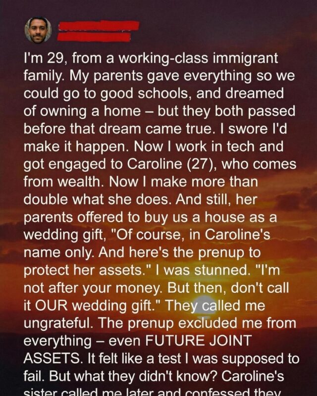 Years later, that promise led me into a career in technology, where persistence slowly turned into stability. I met Caroline during that time, and we built our relationship on shared values, humor, and respect. She came from a background very different from mine, one where security was expected rather than earned. When we got engaged, I felt proud of how far I had comeβnot because of money, but because I had built something meaningful through effort. I never measured our relationship in numbers, so when her parents offered to buy us a house as a wedding gift, I was initially touched by the gesture.