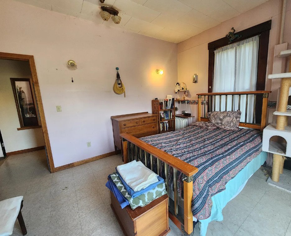 Though time has left its mark, the home still radiates an unmistakable charm. Many of the rooms remain spacious and bright, with tall windows and original moldings that speak of an era when natural light and fine wood detailing were integral to design.