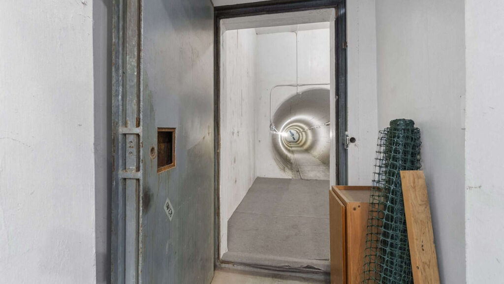 This survival bunker is already partially converted for modern underground bunker living. It features three bedrooms, three bathrooms, kitchen appliances, laundry, and even a private elevator connecting the floors of this underground bunker home. If you’re looking for an underground bunker house or fallout shelter with real livability, this underground bunker for sale checks every box.