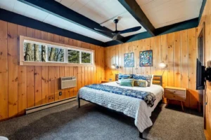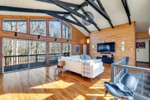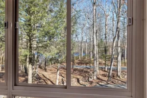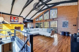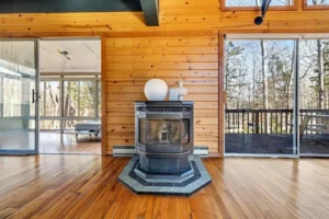Inside, you’ll find soaring cathedral knotty-pine ceilings, a stunning stone wood-burning fireplace complemented by a pellet stove, and expansive windows framing beautiful lake views. The sleek, updated kitchen flows seamlessly into a bright dining area and a spacious sunroom, perfect for relaxing or entertaining.