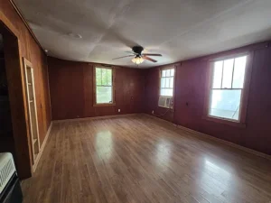 As soon as you step through the door, you’re greeted by a remarkably large living room, a feature not commonly found in cabins of this size. This space immediately sets the tone for the entire home, with its generous layout that allows for a variety of furniture arrangements and design options. Whether you prefer a rustic lodge-style interior, a contemporary cabin feel, or a traditional homey setup, the living room provides a versatile canvas for your vision. It’s the perfect place to unwind after a long day of fishing or exploring the great outdoors, offering plenty of room for comfortable seating, entertainment setups, or even the addition of a cozy wood-burning stove if you choose.