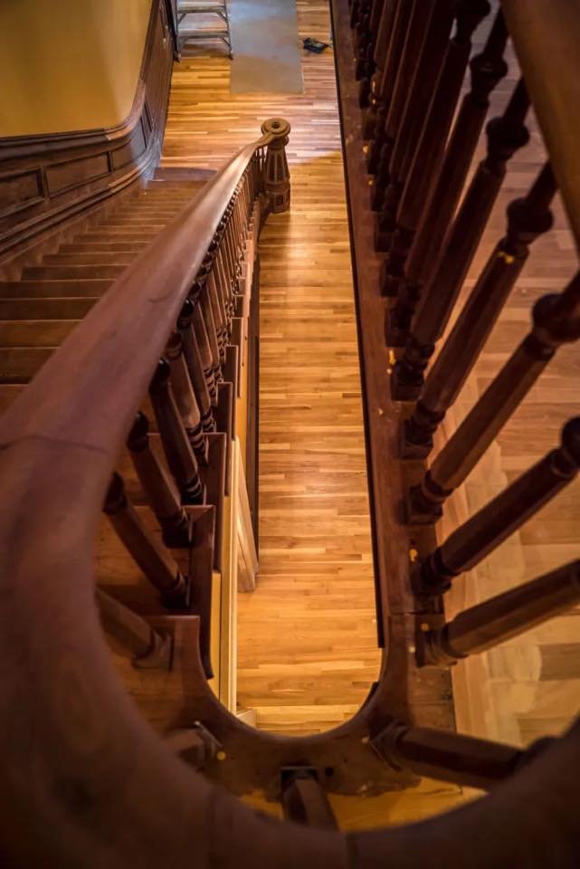 One of the most iconic features, the grand walnut staircase, was salvaged from the rubble and reassembled.