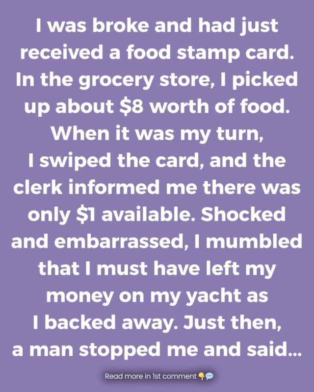 I was broke and had just received a food stamp card. In the grocery store, I picked up about $8 worth of food. When it was my turn, I swiped the card, and the clerk informed me there was only $1 available. Shocked and embarrassed, I mumbled that I must have left my money on my yacht as I backed away. Just then, a man stopped me and said…
