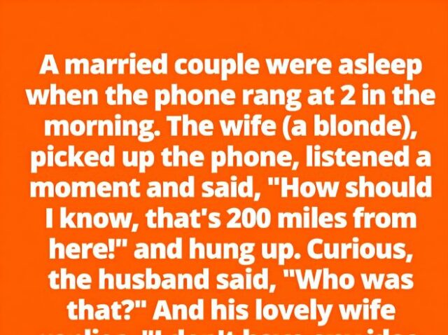 A married couple were asleep when the phone rang at 2 in the morning. The wife picked up the phone, listened a moment and said, ‘How should I know? That’s 200 miles from here!’ and hung up. Curious, the husband said, ‘Who was that?’ And his lovely wife replied…“…I think someone who simply dialed the wrong number,” she said, rubbing her eyes, still half-asleep. But even as she settled back into bed, something about the call lingered in her mind. There had been panic in the stranger’s voice—rushed words, a trembling edge, as if they were desperate for help but unsure whom to turn to. The couple lay there in the dark for a few minutes, the house silent once again, but sleep refused to return. Finally, the wife whispered, “I hope they’re alright.” Her husband, sensing the unease in her tone, reached for her hand. Neither of them knew why the call felt different from an ordinary wrong number—it simply did.