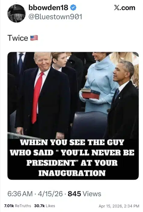 Intent: The post reinforces a personal rivalry and frames Trump’s presidency as a kind of vindication.