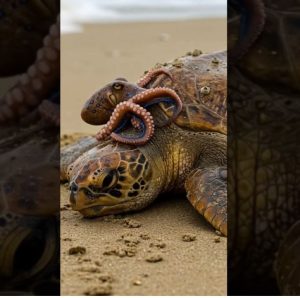 The second octopus reacted defensively, shooting a cloud of ink into the water, turning everything into a dark fog. Sarah’s vision blurred, but she didn’t stop. Through the murky cloud, she reached out and managed to grasp the turtle’s shell, pulling it upward with steady force.