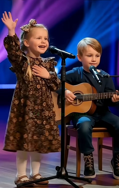 When the lights dimmed and the music hall fell silent, two small figures walked onto the stage hand in hand. A little girl in a floral dress and her brother holding a guitar stood before thousands, yet they carried themselves with a calmness far beyond their years. They weren’t just contestants. They were messengers of something greater—something pure that touched the soul of every person watching.