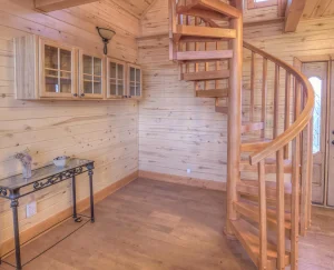 The home features beautifully hewn logs, each carefully selected and shaped to create a stunning visual presence both inside and out. The natural wood tones provide a rustic charm that blends seamlessly with the surrounding landscape.