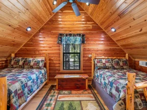 The main-level primary suite ensures convenience and comfort, making the cabin ideal for both full-time living and easy weekend stays.