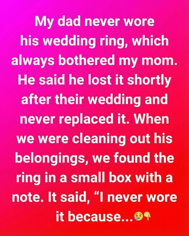 My dad never wore his wedding ring, which always bothered my mom. He said he lost it shortly after their wedding and never replaced it. When we were cleaning out his belongings, we found the ring in a small box with a note. It said, “I never wore it because…” he feared damaging it during work. My dad spent most of his life doing physical labor—building fences, repairing engines, lifting equipment. His hands were always calloused, always moving, and always at risk of getting caught on something sharp. He used to joke that his hands were his tools, and tools shouldn’t wear jewelry. Still, we had all believed the story about the ring being lost. Seeing it tucked away so carefully, wrapped in a soft cloth, felt like uncovering a quiet truth he’d chosen not to burden us with.
