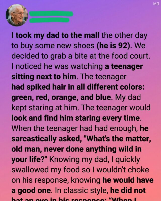 I took my 92-year-old father to the mall last weekend to buy a new pair of shoes, something sturdy but comfortable enough for his daily walks. After finding the perfect pair, we decided to sit down at the food court for a simple lunch. That’s when I noticed he seemed distracted. His eyes kept drifting toward a teenager sitting nearby, a boy with brightly colored spiked hair—green, red, orange, and blue blending together like a living rainbow. The young man shifted in his seat, clearly aware of my father’s repeated glances. I braced myself, unsure of what might unfold between two generations shaped by very different worlds.