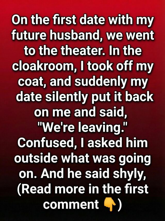 On our very first date, everything felt carefully planned yet quietly uncertain, like the opening scene of a play. We had chosen a small, elegant theater downtown, the kind with velvet curtains and soft golden lighting. I remember feeling a mix of excitement and nervousness as we stepped inside, both of us trying to appear calm while clearly aware of the significance of the evening. In the cloakroom, I slipped off my coat, ready to settle into the night, when he gently stopped me. Without a word, he placed the coat back over my shoulders and said softly, “We’re leaving.”